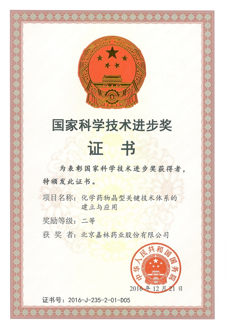 1月9日,2016年度國家科學(xué)技術(shù)獎(jiǎng)勵(lì)大會(huì)在北京人民大會(huì)堂隆重舉行。黨和國家領(lǐng)導(dǎo)人習(xí)近平、李克強(qiáng)、劉云山、張高麗出席大會(huì)并為獲獎(jiǎng)代表頒獎(jiǎng)。我公司作為獲獎(jiǎng)項(xiàng)目“化學(xué)藥物晶型關(guān)鍵技術(shù)體系的建立與應(yīng)用”的主要完成單位,公司和公司總裁劉偉先生榮獲國家科技進(jìn)步二等獎(jiǎng)。
